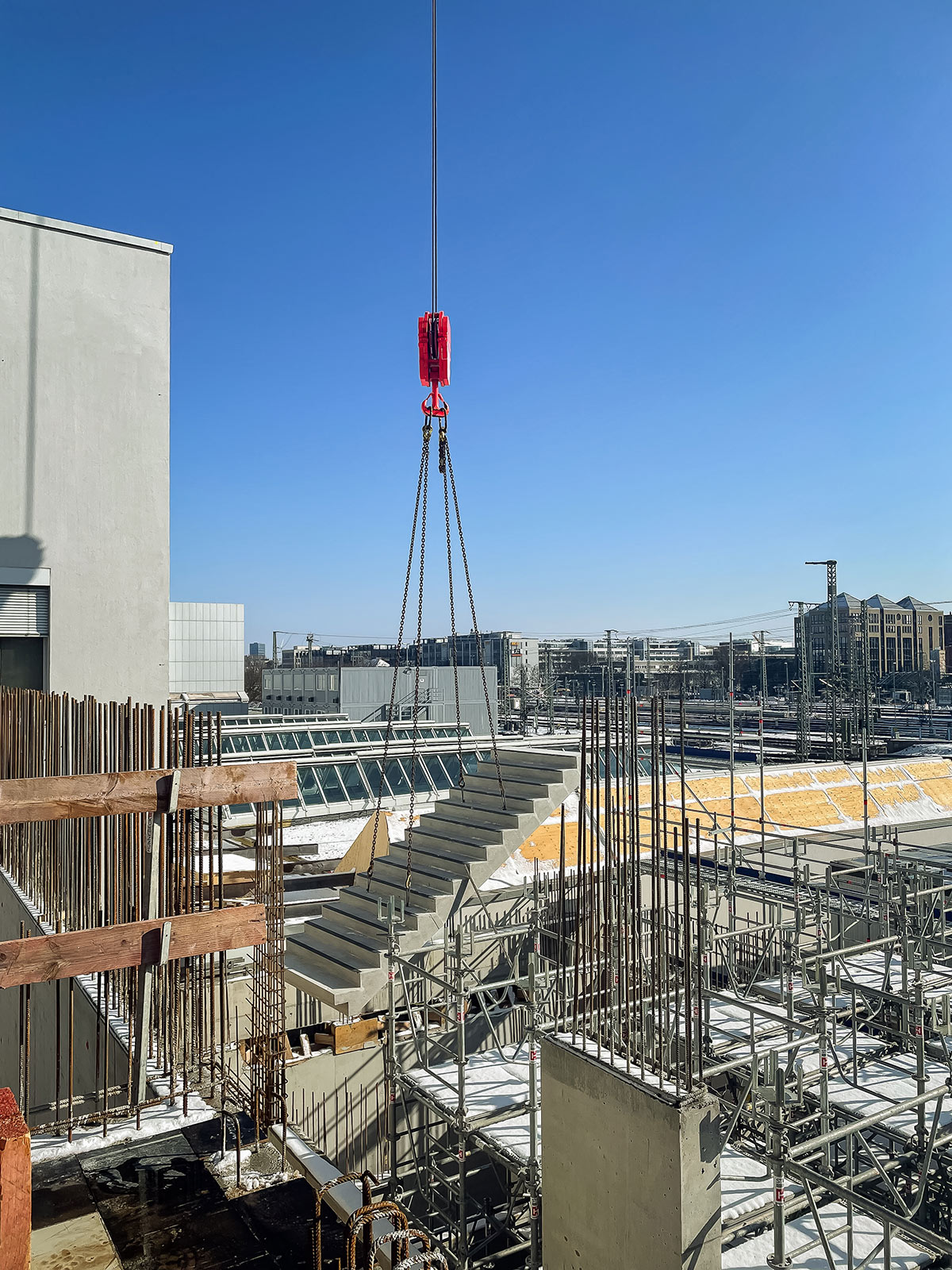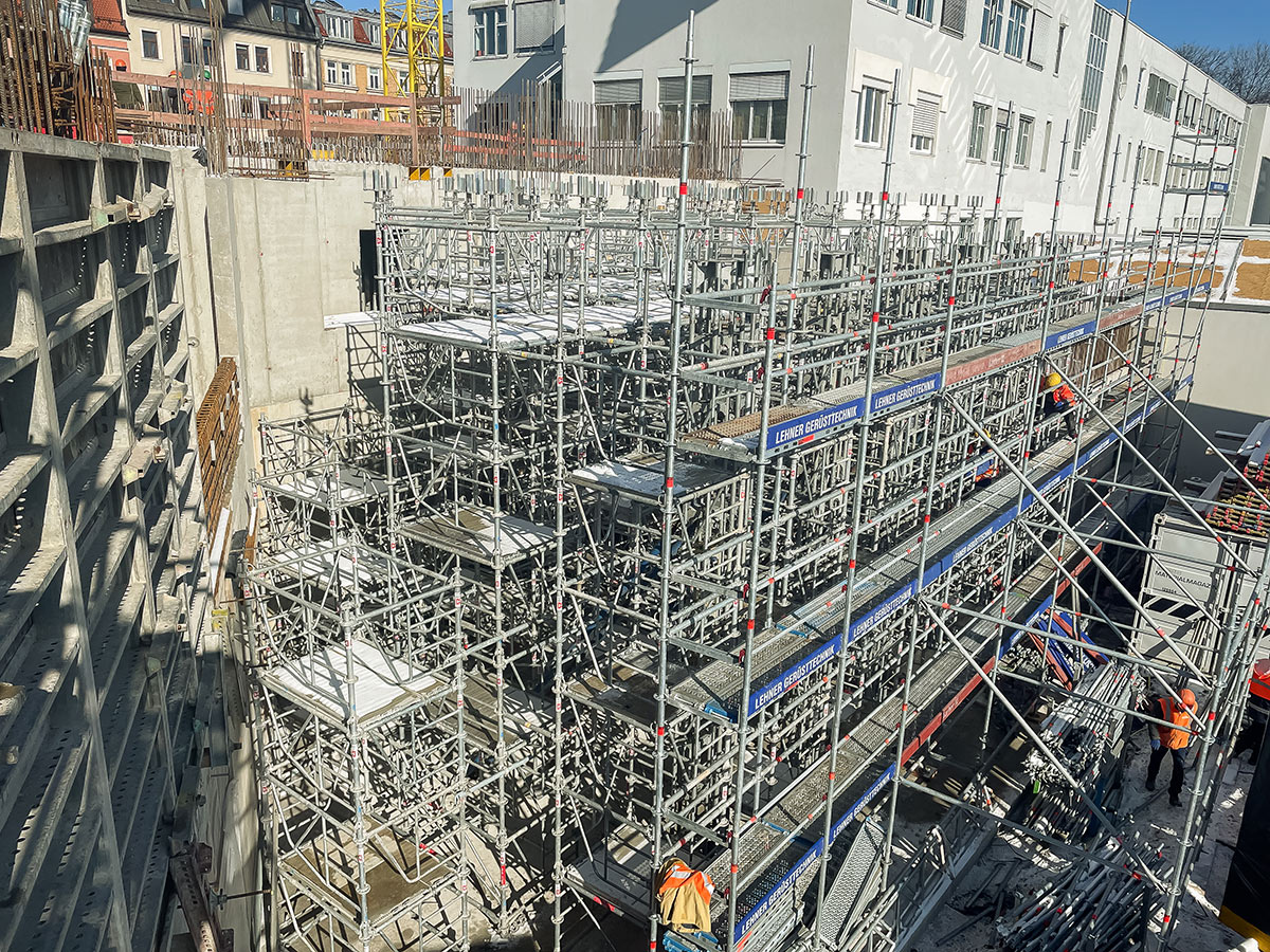 Im Oktober 2023 startete unser Team mit umfangreichen Erdarbeiten in mehr als acht Metern Tiefe und meisterte dabei viele Herausforderungen. Unter anderem verläuft quer durch das Bauvorhaben ein Bestandskanal. Dieser wird in das Gebäude integriert. Außerdem sind viele Wände in der anspruchsvollen Sichtbetonklasse 3 auszuführen.
