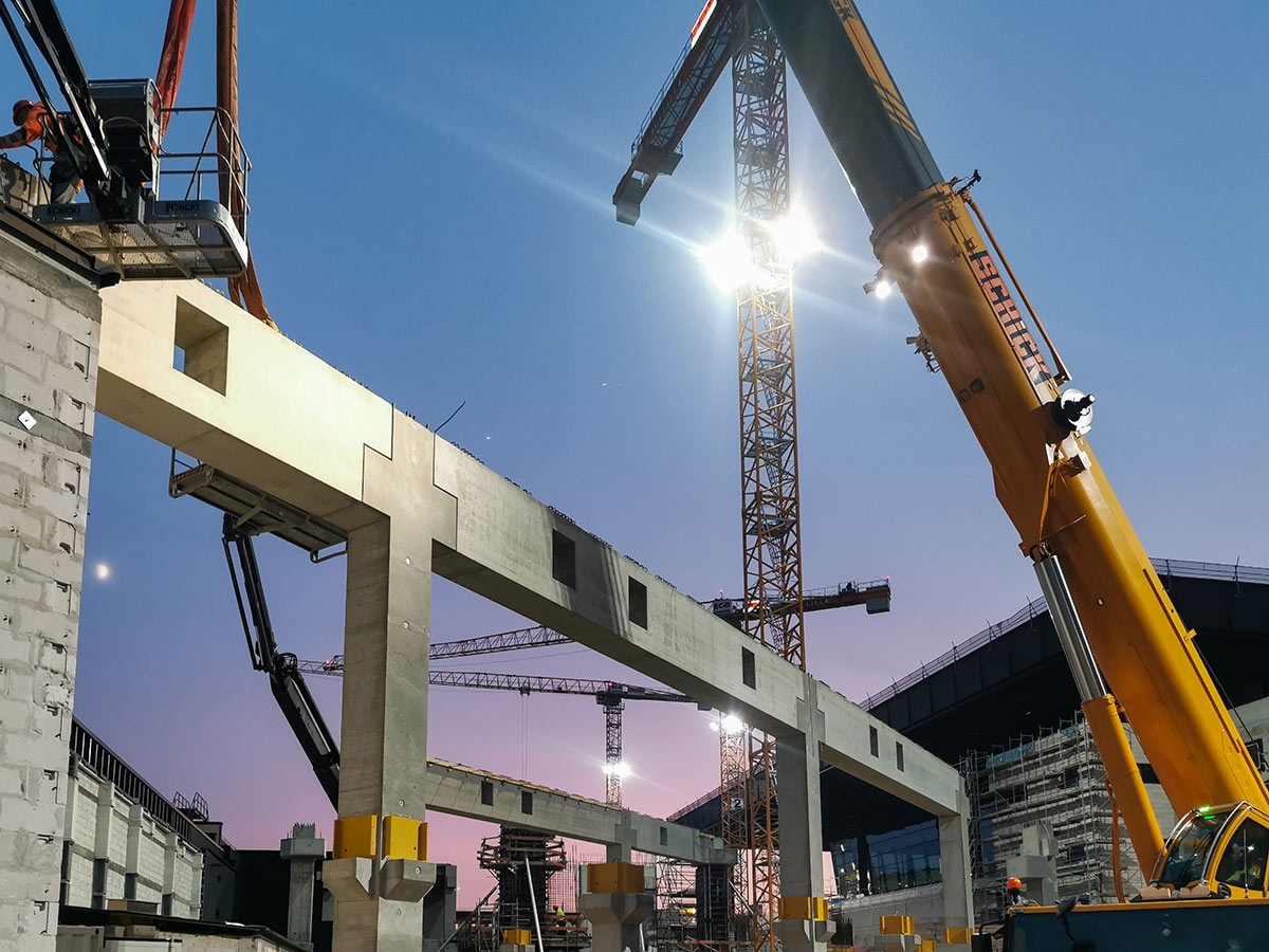 Ein entscheidender Erfolgsfaktor war die enge Verzahnung zwischen Baustelle und industrieller Fertigung. Der Betonfertigteilbau in den firmeneigenen Werken in Hanau und Bad Kissingen bildete das Rückgrat des Rohbaus. Zahlreiche konstruktive Elemente wurden unter kontrollierten Bedingungen im Werk produziert und mithilfe der eigenen Logistikflotte just-in-time zur Baustelle geliefert. Dort griffen Fertigteilmontage, Ortbetonarbeiten, Schalungs- und Bewehrungsleistungen nahtlos ineinander.