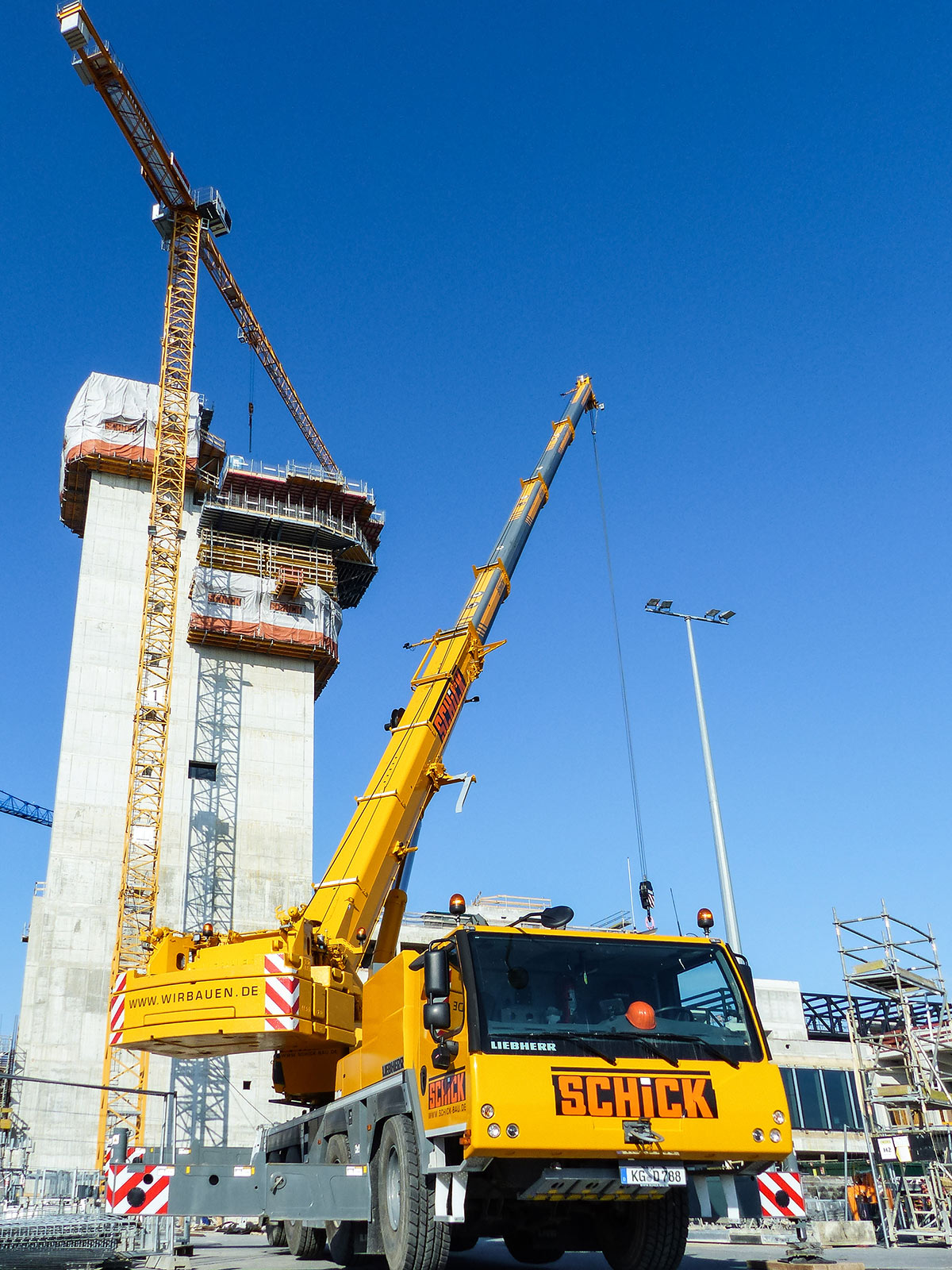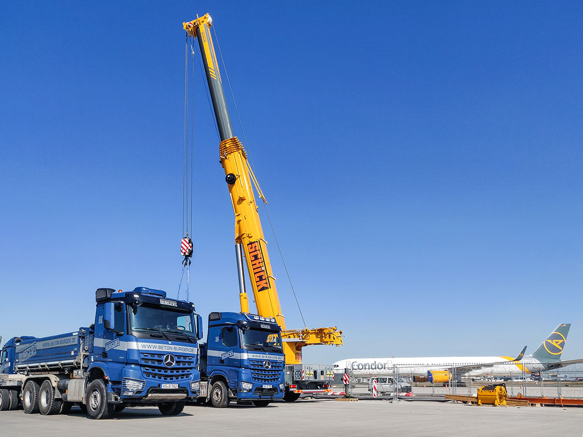 Die Anton Schick GmbH verantwortete den erweiterten Rohbau der Flugsteige H und J inklusive des rund 69 Meter hohen Vorfeldkontrollturms sowie die Bauabschnitte 2.1 und 2.2 am Pier G. In Spitzenzeiten waren bis zu 350 Mitarbeitende und 15 Turmdrehkräne gleichzeitig im Einsatz. Sie prägten das Baufeld und sorgten dafür, dass mehrere Bauabschnitte zeitgleich realisiert werden konnten. Parallele Prozesse wurden dabei nicht nur koordiniert – sie wurden präzise aufeinander abgestimmt.