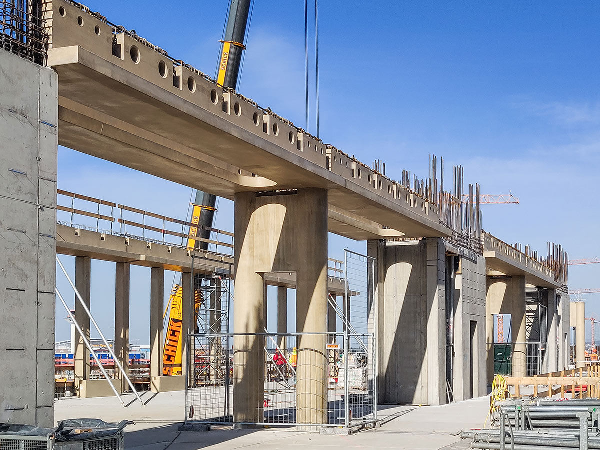 Die Flugsteige H und J entstanden in modularer Bauweise: Sieben beziehungsweise acht identische Teilbauwerke wurden parallel errichtet und nach dem Aushärten monolithisch miteinander verbunden. Dieses Vorgehen ermöglichte einen kontinuierlichen Baufortschritt bei gleichzeitig hoher Ausführungsqualität.