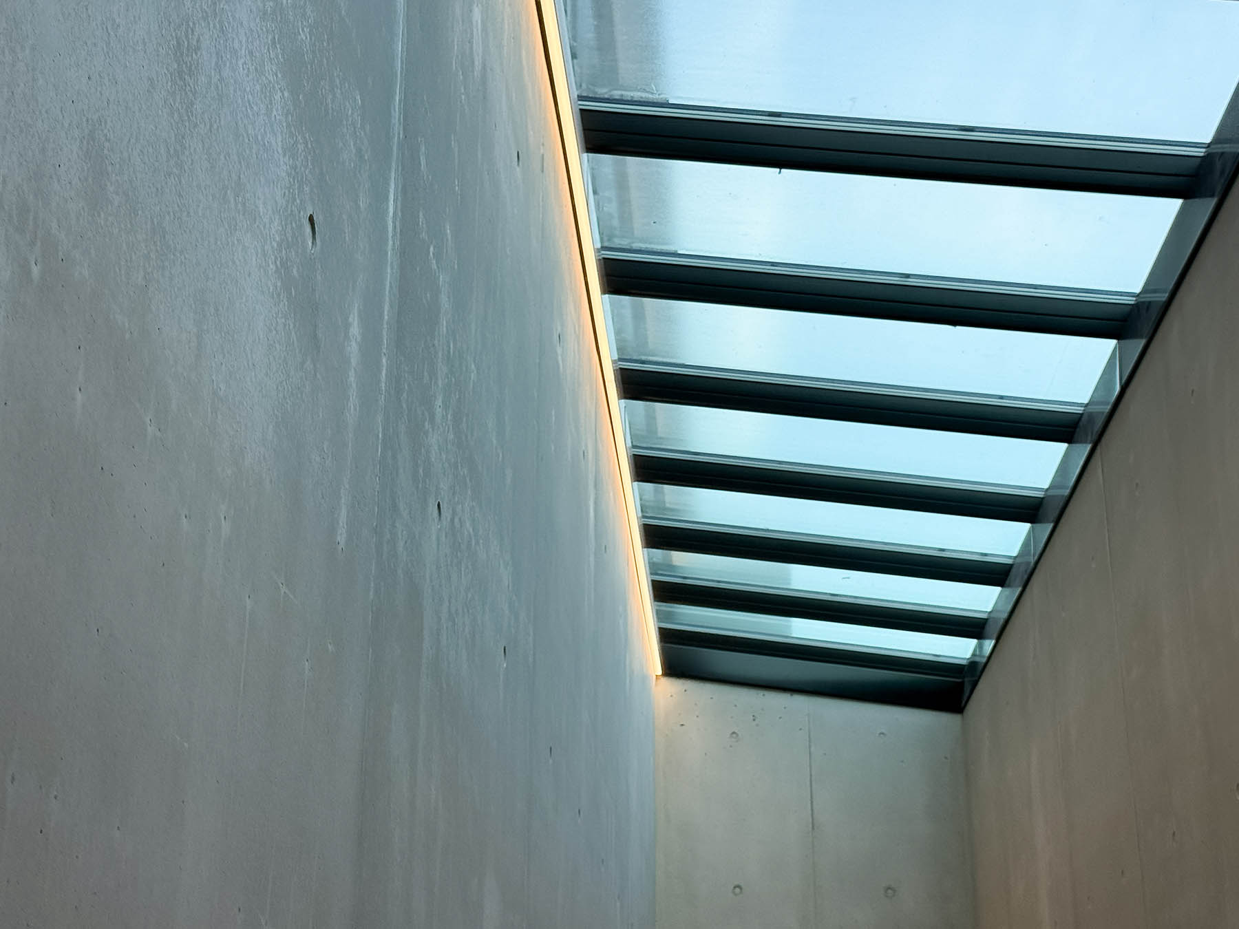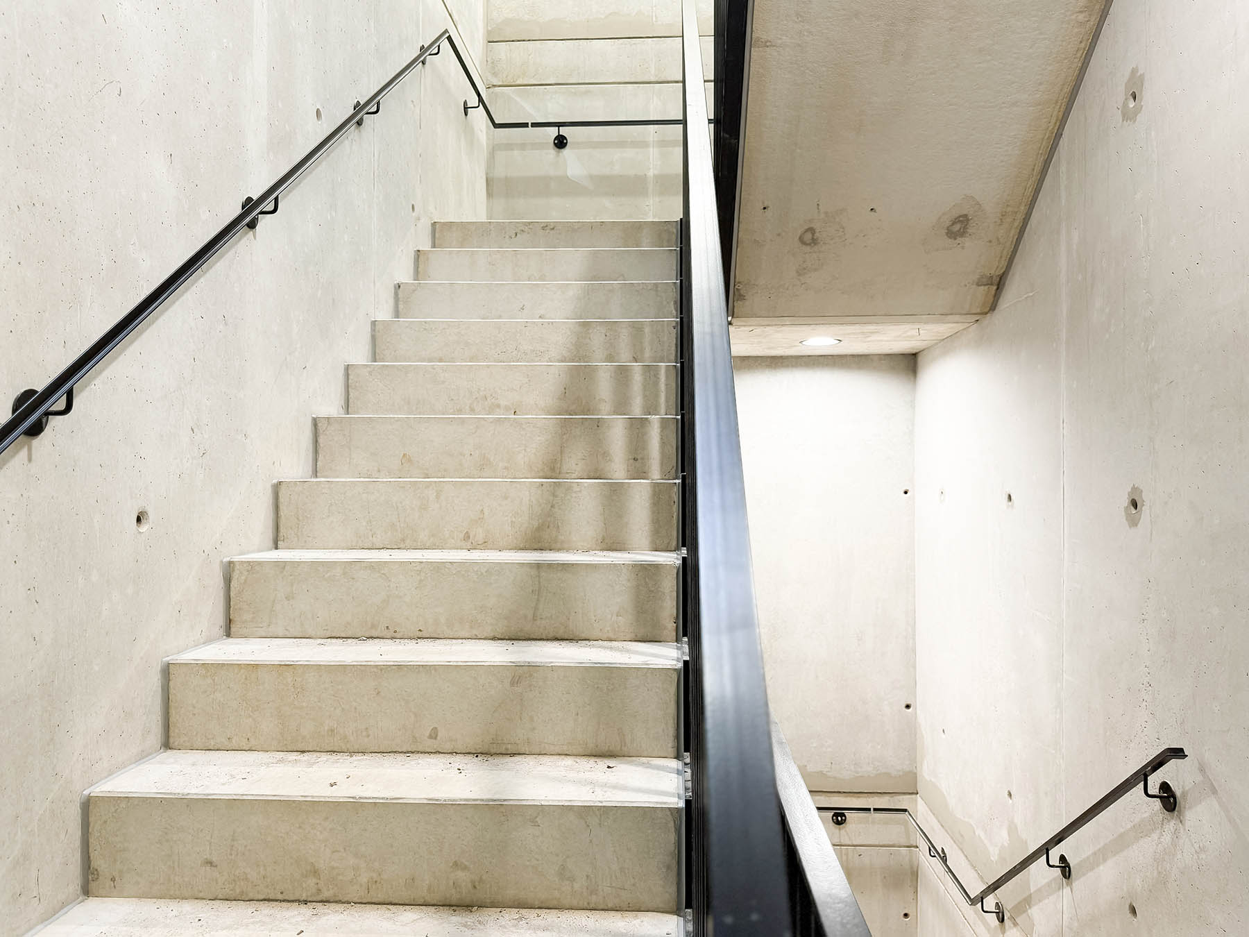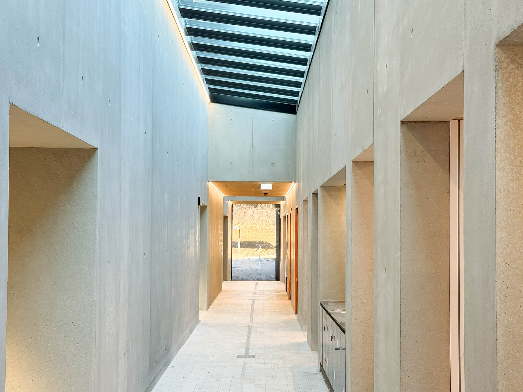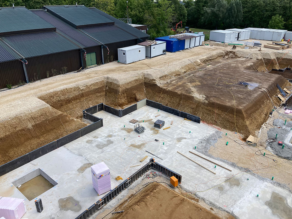 Besonders hohe Anforderungen stellte die Sichtbetonqualität: Ein durchgängiges Schalanker-Raster, integrierte Sitz-, Waschbecken- und Schranknischen sowie nachträglich hergestellte Maschinenfundamente und Sitzbänke mussten präzise geplant und umgesetzt werden. Die wesentlichen Sichtbetonarbeiten erfolgten zudem überwiegend in den Wintermonaten.