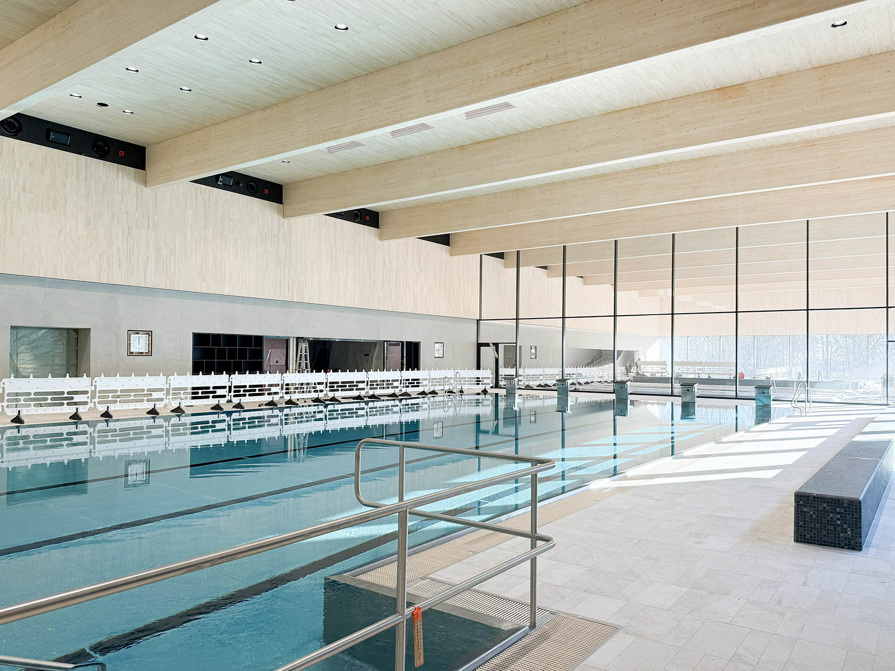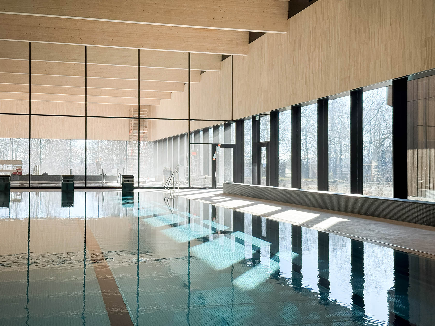 Die Bauausführung war durch mehrere anspruchsvolle Randbedingungen geprägt. Massive Stahlbetonwände wurden auf einer Stahlstützen-Fensterfassade gegründet, der Boden des Schwimmerbeckens wurde mit schräger Geometrie ausgeführt, und die Deckenhöhe über der Rutsche beträgt bis zu 8,30 Meter.
