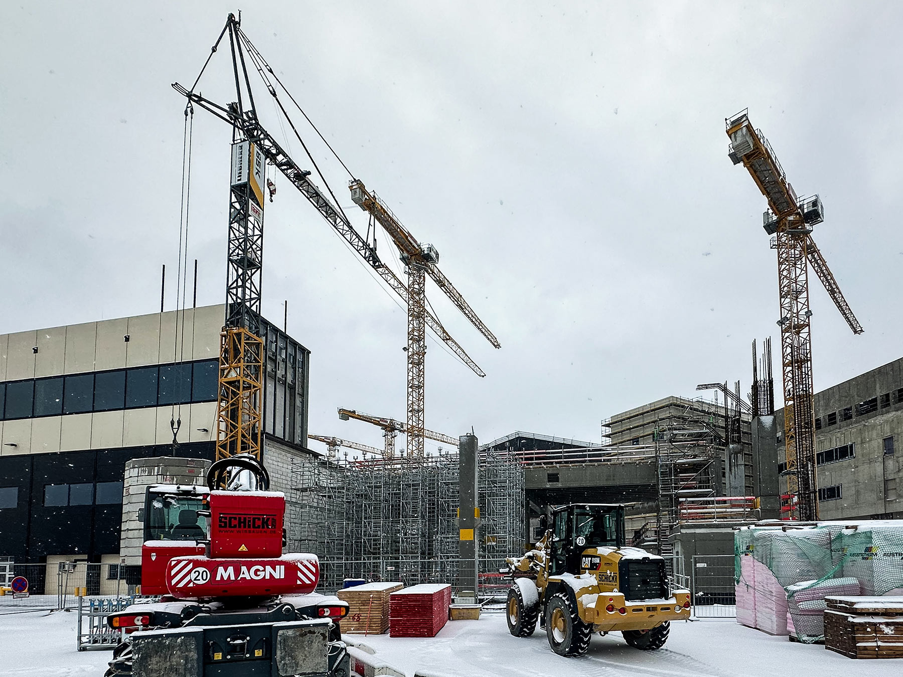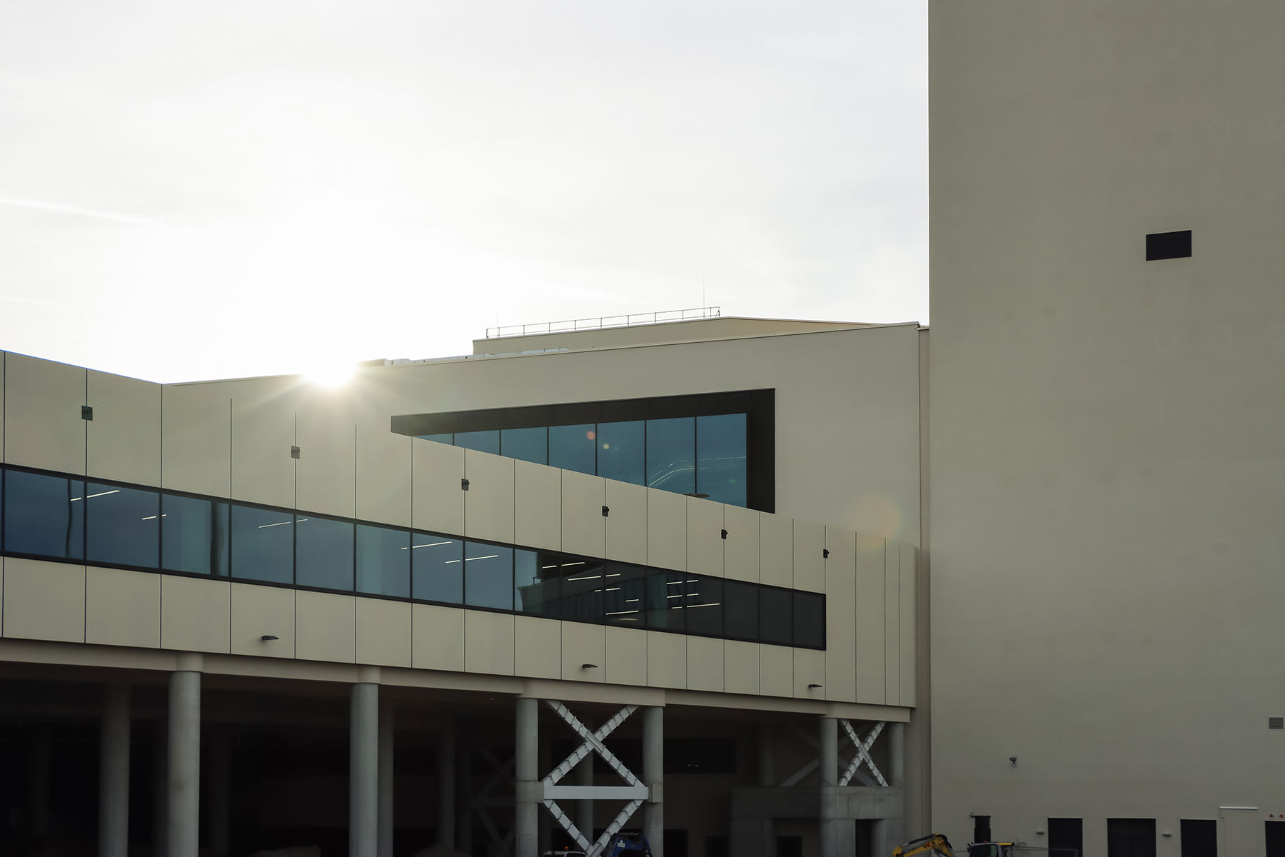 Zwei markante Oberlichter und drei Technikzentralen auf dem Dach prägen die Silhouette und sorgen für Licht und Funktion. Abgeschlossen wurde das Projekt mit einer Dachabdichtung samt Begrünung, die sowohl gestalterische als auch ökologische Akzente setzt.