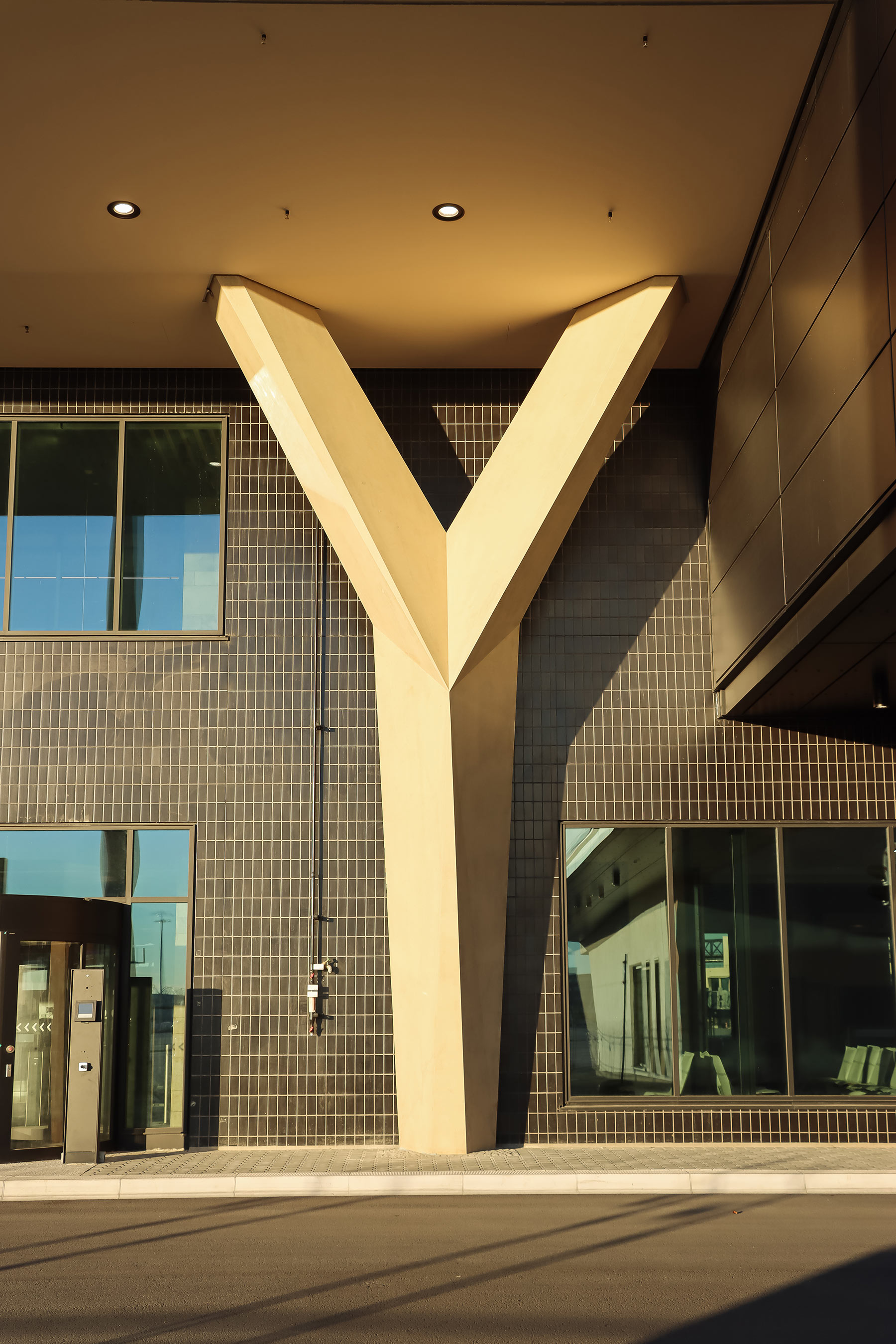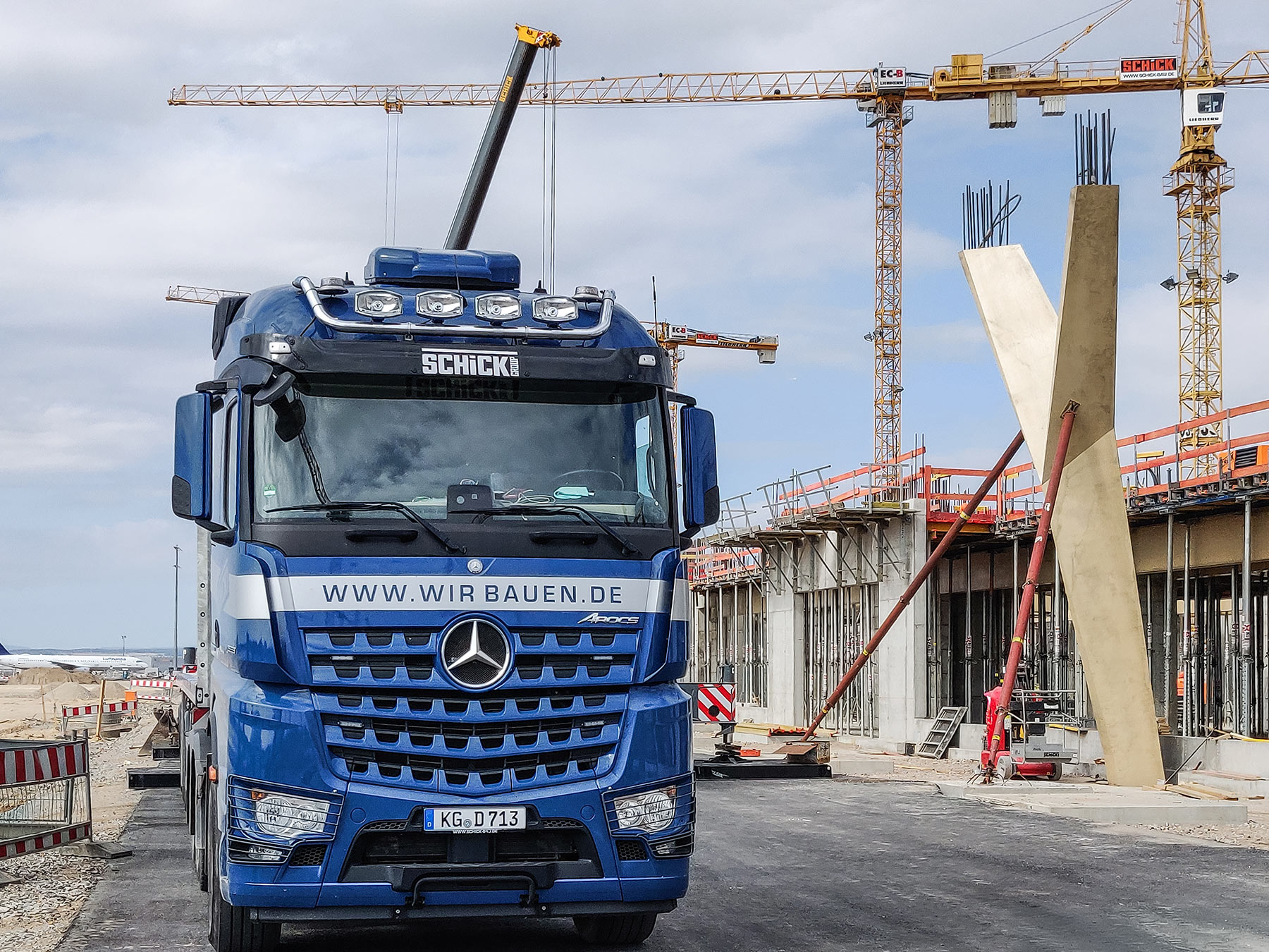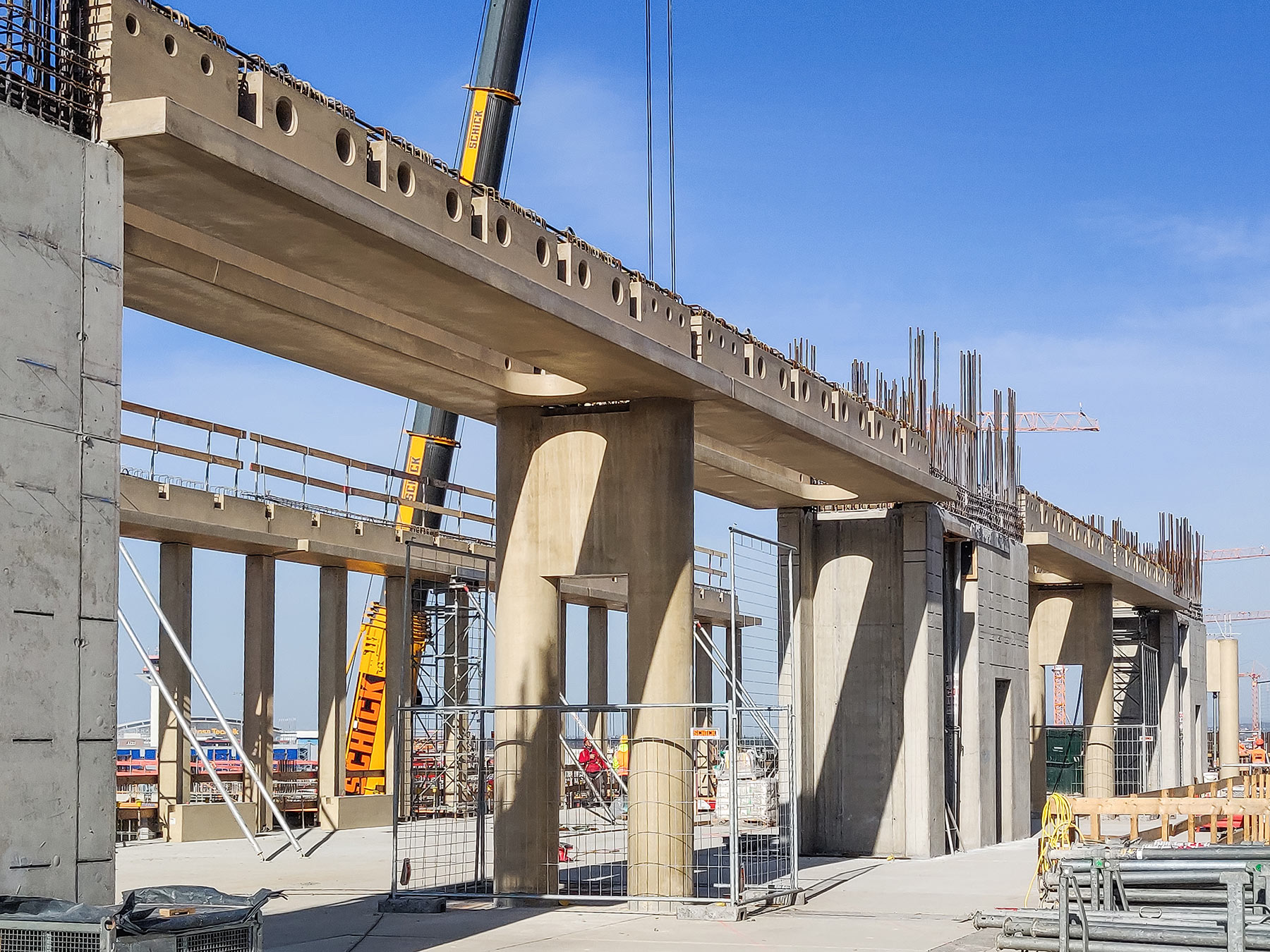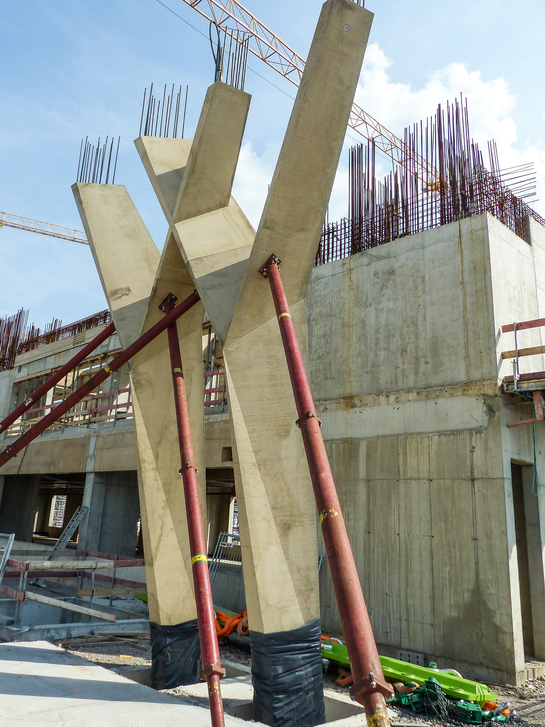 Es gibt sechs verschiedene Typen der Y-Stützen am Pier J. Die meisten sind 10,8 Meter lang, sieben Grad geneigt und erreichen dadurch eine lichte Höhe von rund zehn Metern. An der oberen Gabelung erstreckt sich die Breite über fünf Meter. Mit 22,5 Tonnen Gewicht, acht Kubikmetern Beton und drei Tonnen Bewehrungsstahl pro Stütze handelt es sich um hochkomplexe Bauteile. Sie tragen die auskragende Decke der Ebene 2 und leiten Lasten sicher in den Boden ab. Gefertigt wurden sie im eigenen Betonfertigteilwerk, wo gleichbleibende Bedingungen und optimierte Prozesse höchste Sichtbetonqualität ermöglichen. Scharfe Kanten, komplexe Winkel und die Betongüte C50/60 bis C80/95 erfüllen höchste Anforderungen. Nach der Produktion erfolgte der Transport per Schwerlast in Nachtfahrten mit firmeneigenen Lkws und Begleitfahrzeugen.