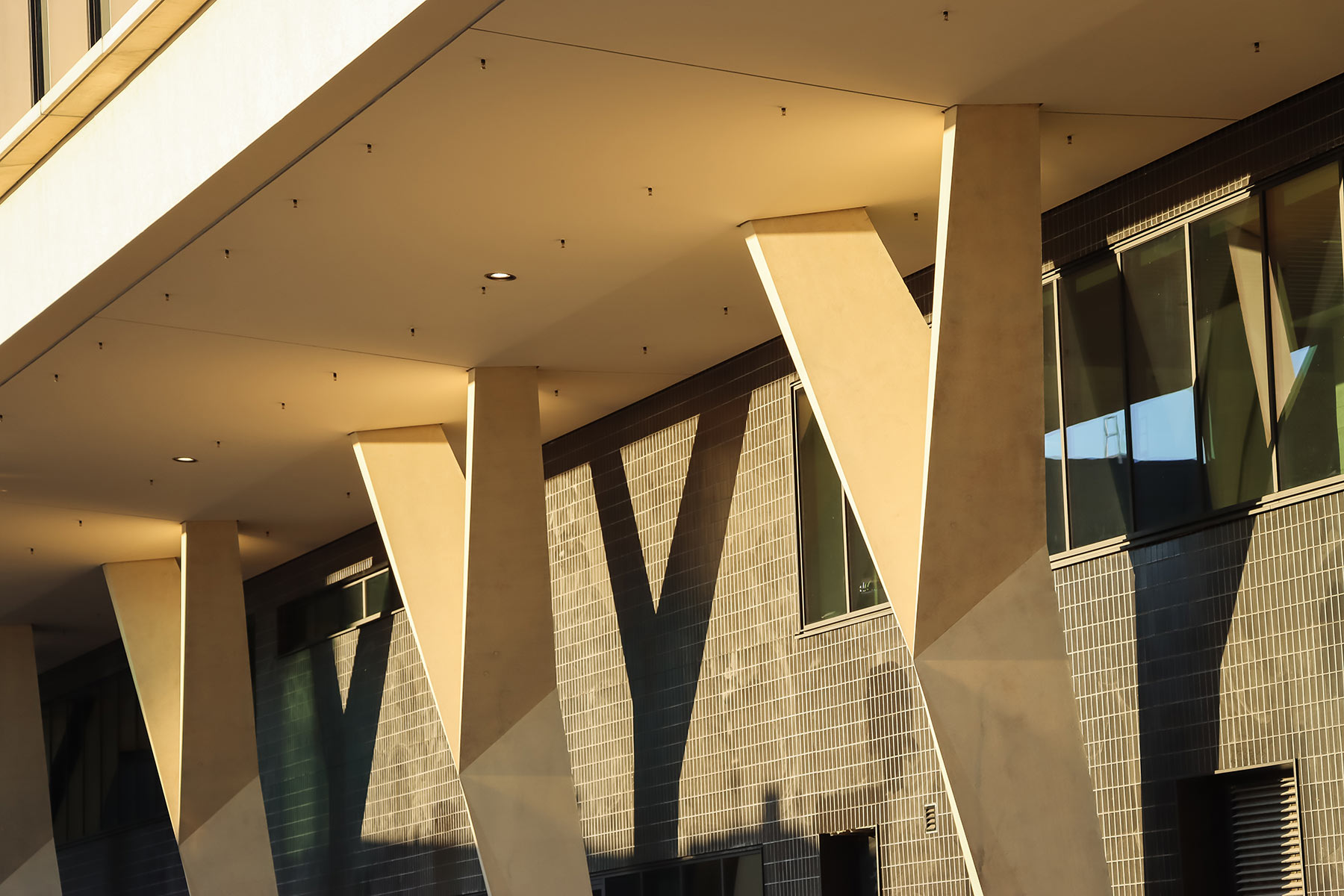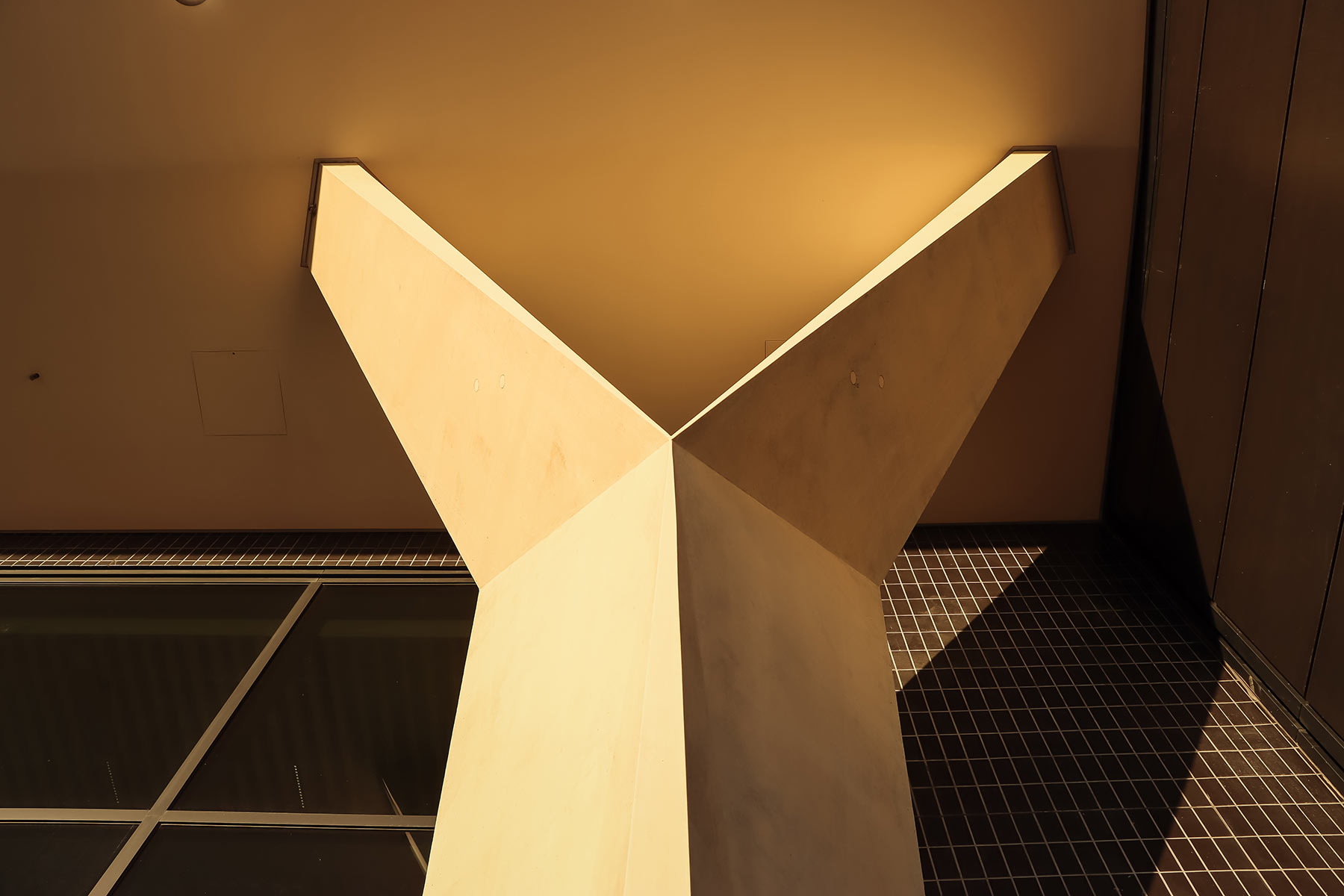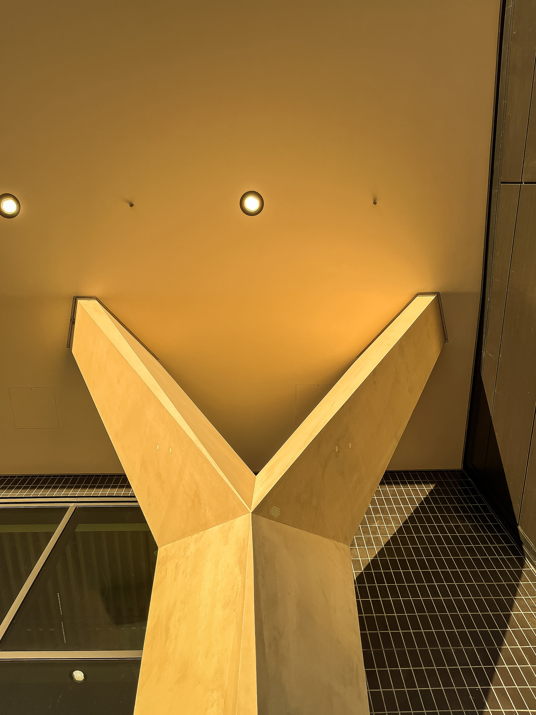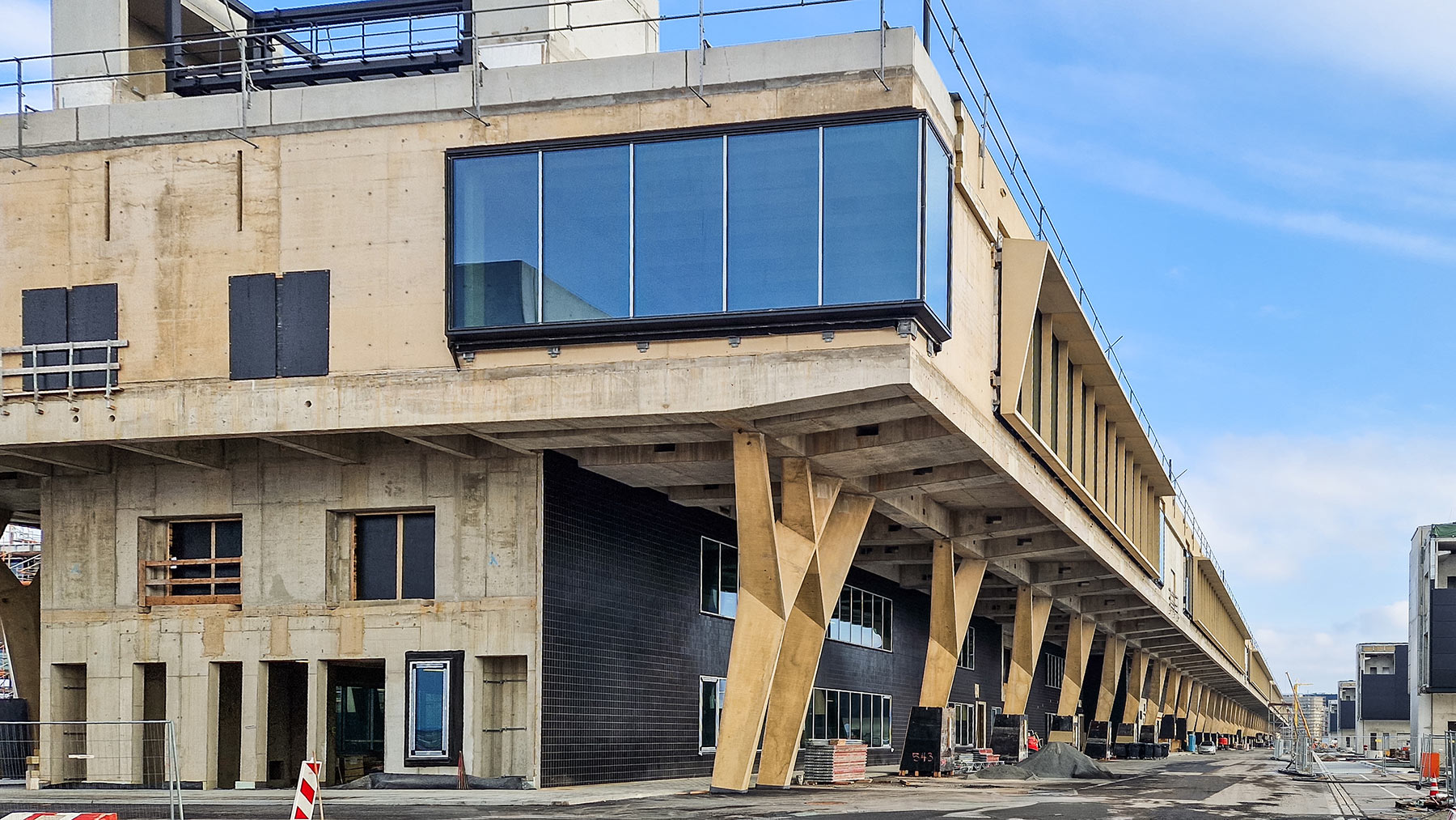 Es gibt sechs verschiedene Typen der Y-Stützen am Pier J. Die meisten sind 10,8 Meter lang, sieben Grad geneigt und erreichen dadurch eine lichte Höhe von rund zehn Metern. An der oberen Gabelung erstreckt sich die Breite über fünf Meter. Mit 22,5 Tonnen Gewicht, acht Kubikmetern Beton und drei Tonnen Bewehrungsstahl pro Stütze handelt es sich um hochkomplexe Bauteile. Sie tragen die auskragende Decke der Ebene 2 und leiten Lasten sicher in den Boden ab. Gefertigt wurden sie im eigenen Betonfertigteilwerk, wo gleichbleibende Bedingungen und optimierte Prozesse höchste Sichtbetonqualität ermöglichen. Scharfe Kanten, komplexe Winkel und die Betongüte C50/60 bis C80/95 erfüllen höchste Anforderungen. Nach der Produktion erfolgte der Transport per Schwerlast in Nachtfahrten mit firmeneigenen Lkws und Begleitfahrzeugen.