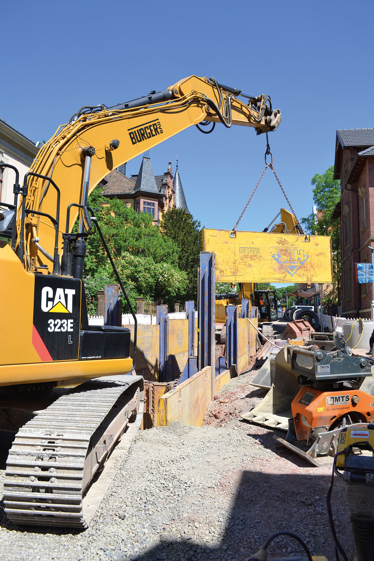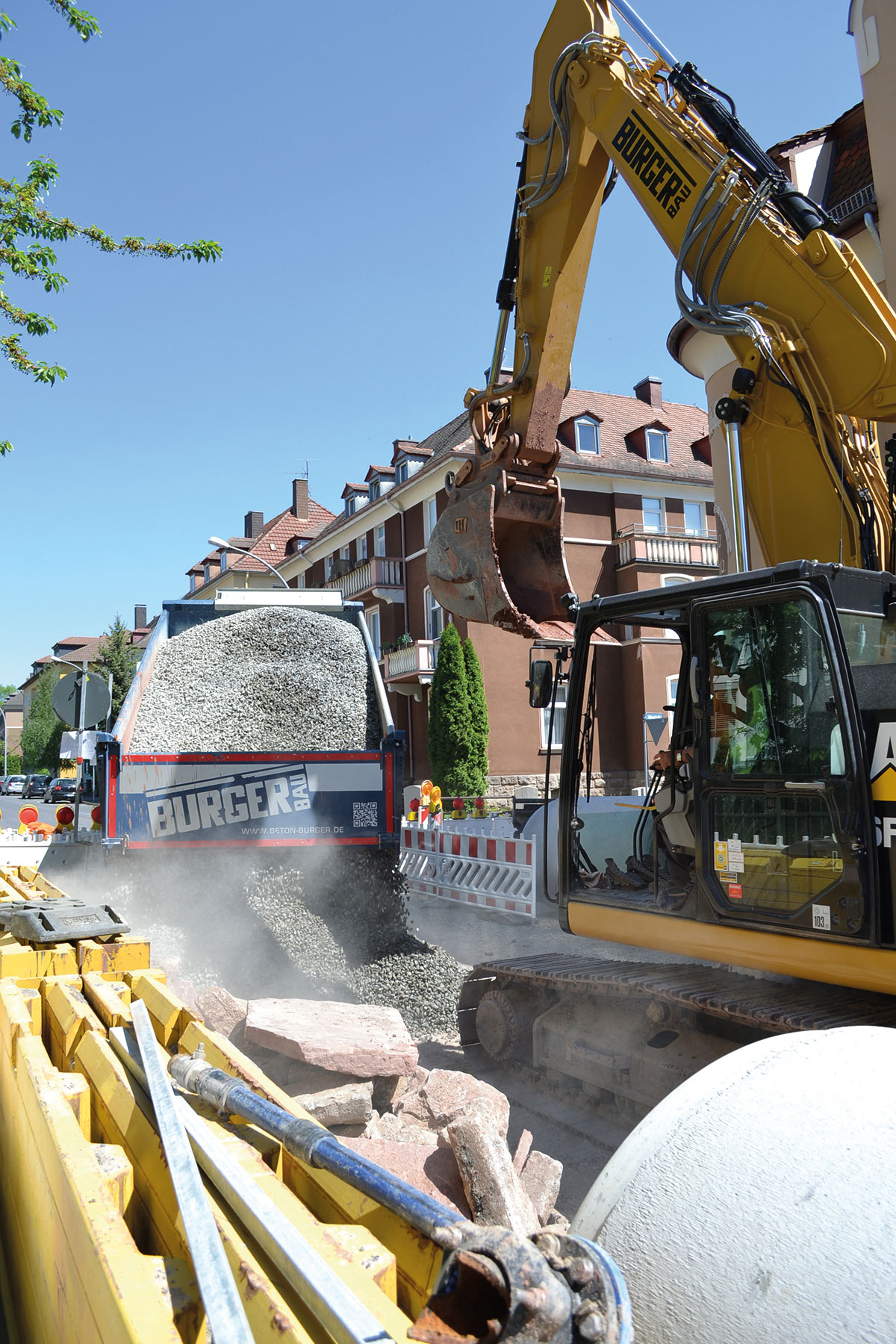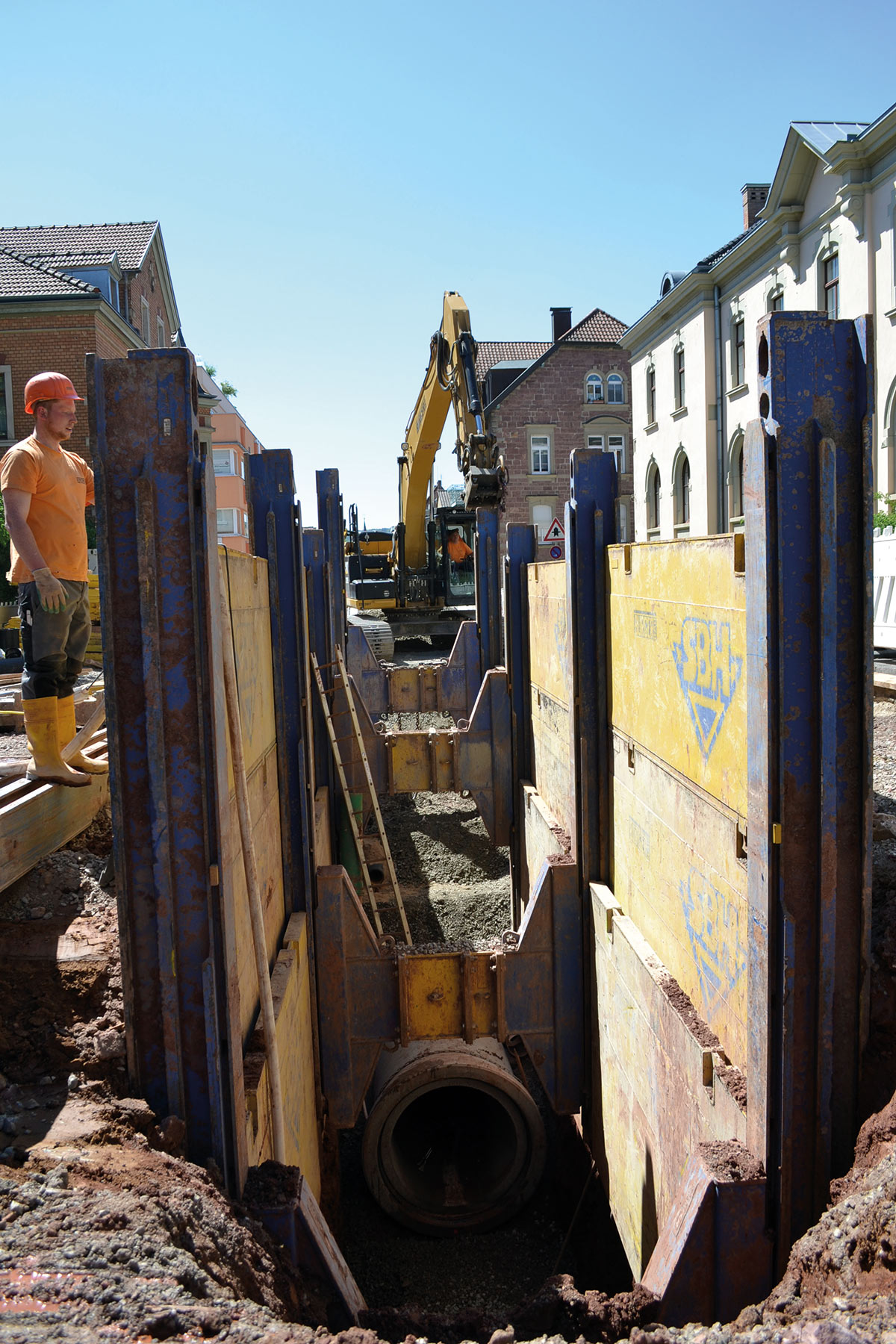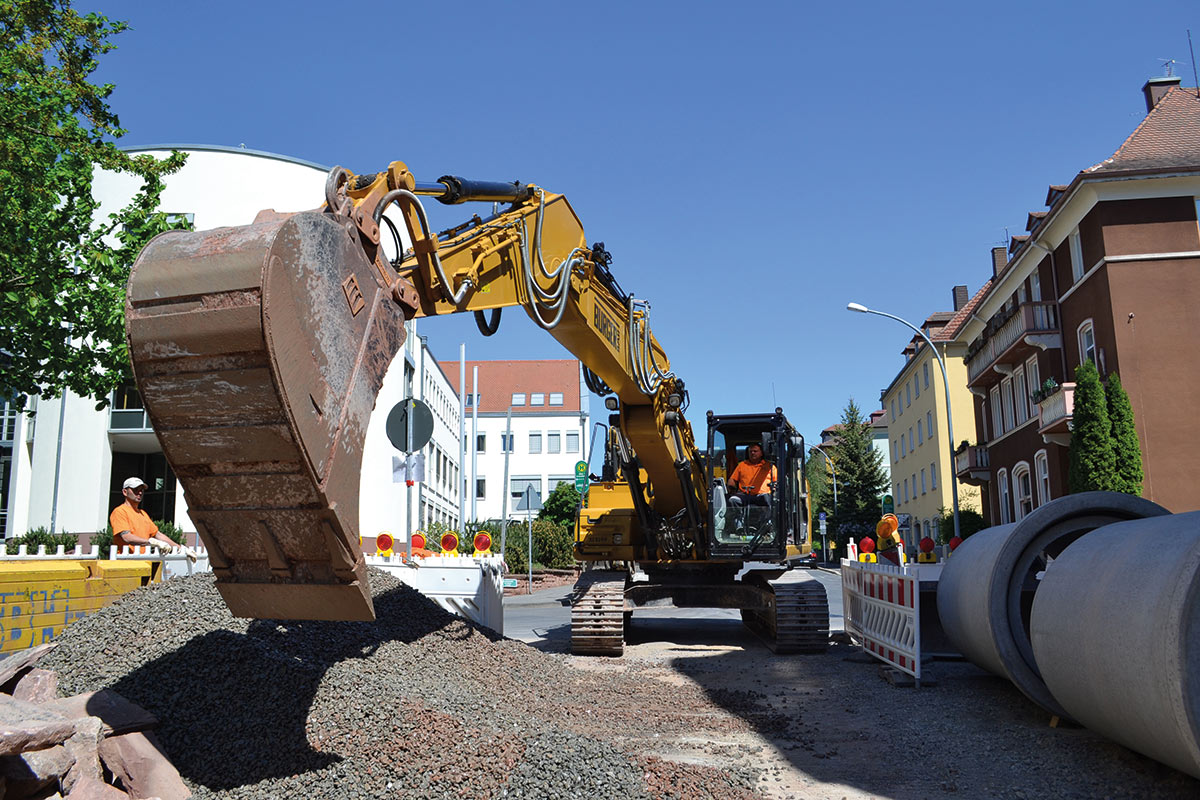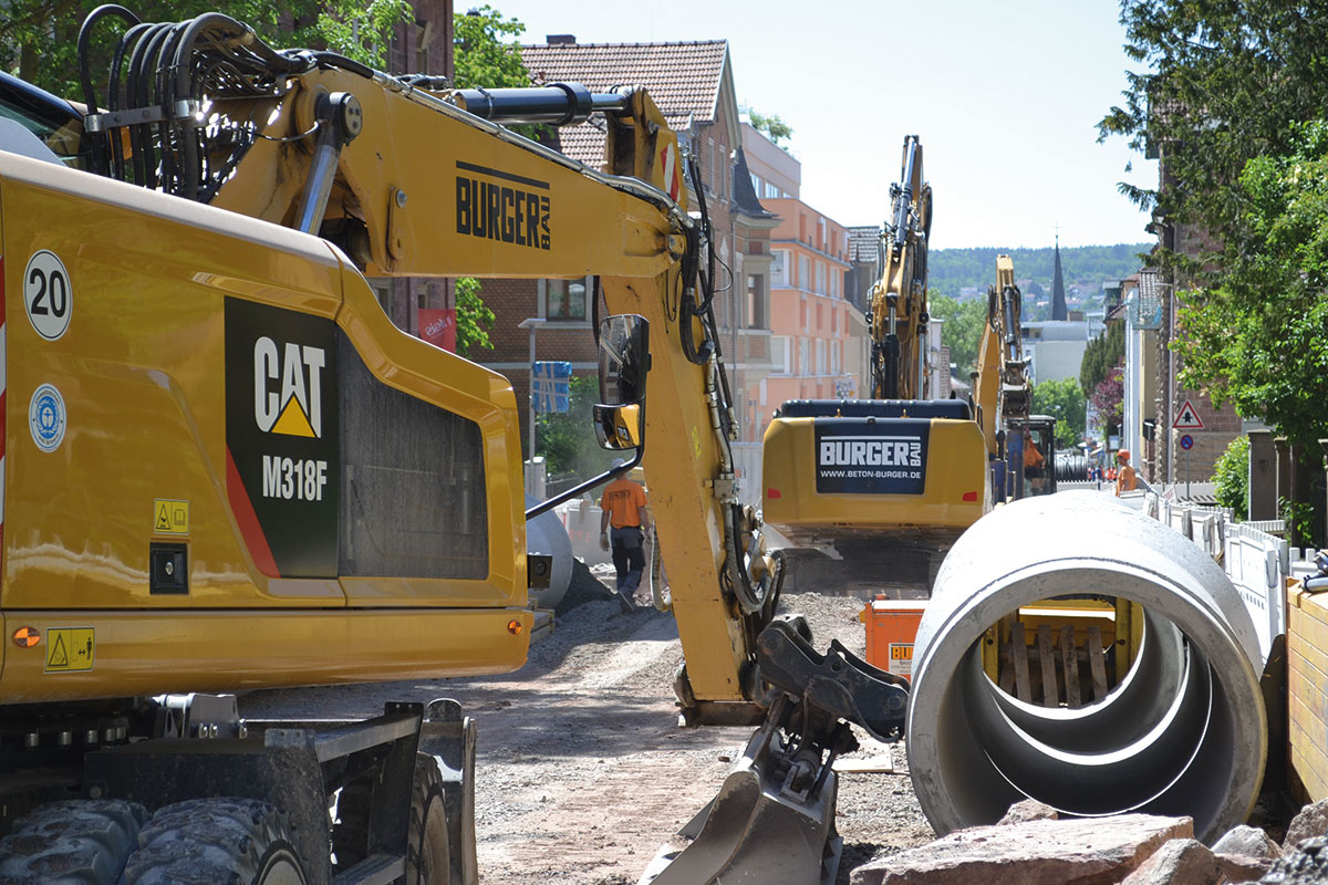 Die vor der Straßenerneuerung erforderlichen rund 650 Meter Kanalleitungen bis DN1200 in bis zu sieben Metern Tiefe verlegen sich natürlich nicht von selbst. Deswegen benötigten wir neben unserem professionellen Team von Polier:innen, Maschinist:innen und Facharbeiter:innen vor Ort auch die entsprechende Ausstattung.